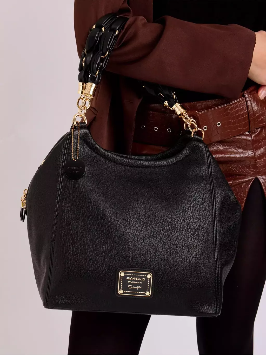 Clásica, sí, pero con carácter. Esta cartera negra eleva cualquier look con su diseño atemporal y detalles que hacen la diferencia: asas trenzadas que combinan cadena metálica con símil cuero, interior espacioso y funcional con bolsillos bien distribuidos (uno con cierre).