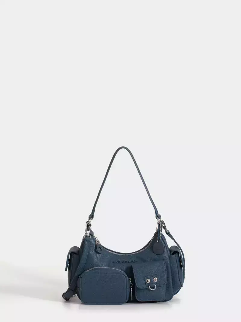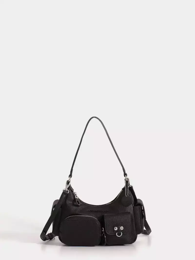 Cuenta con cuatro bolsillos externos, múltiples compartimentos internos (uno con cierre), portallaves, correa regulable y extraíble, y asa corta desmontable.