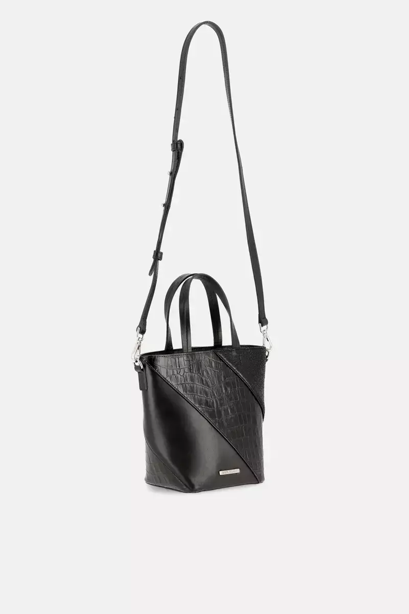 Mini Bag Find Compacta pero con carácter. Misma estética de recortes en cueros negros, manija corta y correa larga regulable. Perfecta para salidas rápidas con estilo.